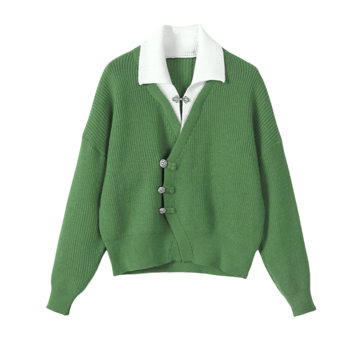 - The design cleverly combines elements of a classic cardigan with a faux layered shirt or sweater underneath, offering a sophisticated look without the bulk.